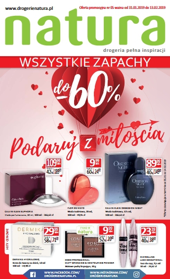 {loadposition linkNatura} 'Wszystkie zapachy do -60%. Podaruj z miłością' - nowa gazetka promocyjna Drogerii Natura. Polecane promocje z gazetki Drogerii Natura: Woda perfumowana damska Calvin Klein Euphoria 30 ml - 109,99 zł. Woda toaletowa damska Flor De Mayo…