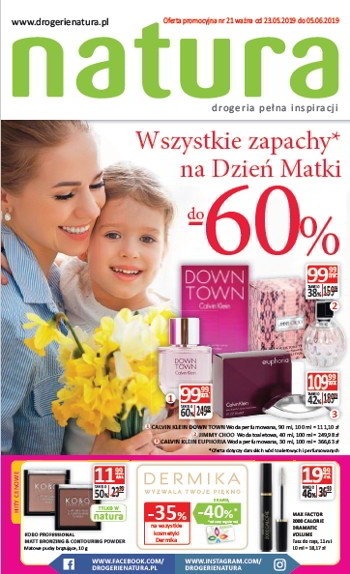 {loadposition linkNatura} 'Wszystkie zapachy na Dzień Matki do -60%' - nowa gazetka promocyjna Drogerii Natura. Polecane promocje z gazetki Drogerii Natura: Woda perfumowana damska Calvin Klein Down Town 90 ml - 99,99 zł. Woda toaletowa damska Jimmy Choo 40…