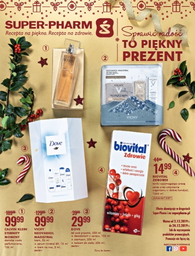 'Sprawić radość to piękny prezent' - nowa gazetka promocyjna Super-Pharm. Polecane promocje z gazetki Super-Pharm: Woda perfumowana damska Calvin Klein Eternity 100 ml - 99,99 zł. Zestaw Dove - 29,99 zł. Tonik wspomagający pracę serca oraz utrzymanie…