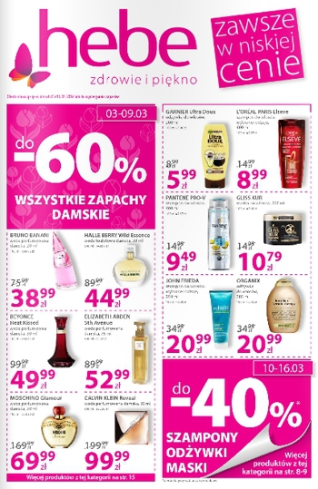 {loadposition linkHebe} Nowa gazetka promocyjna drogerii Hebe - "Wszystkie zapachy damskie do -60%". Polecane promocje z gazetki Hebe: Woda perfumowana damska Bruno Banani 20 ml - 38,99 zł. Woda toaletowa damska Halle Berry Wild Esence 30 ml - 44,99…
