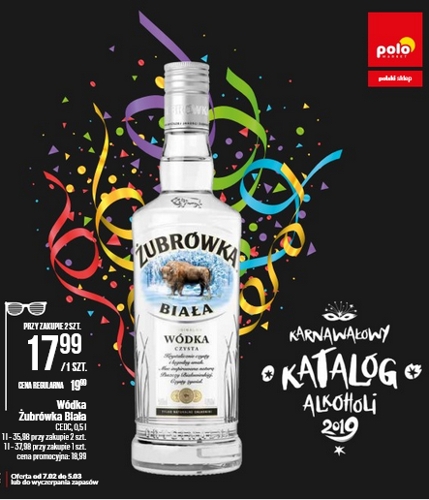 Karnawałowy katalog alkoholi Polo Market 2019. Polecane promocje z katalogu Polo Market: Wódka Żubrowka Biała 2x500 ml - 35,98 zł. Wódka Żołądkowa Czysta de Luxe 500 ml - 18,99 zł. Wódka Husaria 500 ml - 19,99 zł. …