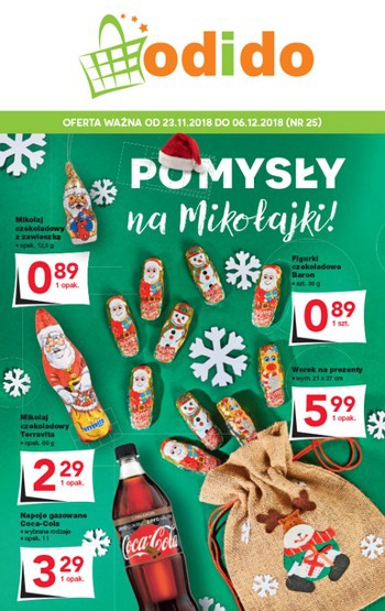 'Pomysły na Mikołajki' - nowa gazetka promocyjna sklepów Odido. Polecane promocje z gazetki Odido: Mikołaj czekoladowy z zawieszką - 0,89 zł. Figurka czekoladowa Baron - 0,89 zł. Worek na prezenty - 5,99 zł. Oferta ważna od…