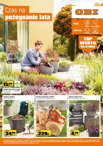 {loadposition linkObi} 'Czas na pożegnanie lata' - nowa gazetka promocyjna sieci marketów Obi. Polecane promocje z gazetki Obi: Podłoże bez torfu Kronen 40 L - 15,99 zł. Taczka Load&Go 55 L - 34,99 zł. Wrzos Garden Girls - 4,49…
