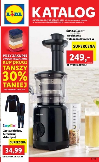 Nowa gazetka promocyjna sieci sklepów Lidl. Polecane promocje z gazetki sklepów Lidl: Wyciskarka wolnoobrotowa SilverCrest 300 W - 249 zł. Zestaw bielizny termicznej dziecięcej Lupilu - 34,99 zł. Kurtka zimowa dziecięca Crivit - 64,90 zł. Oferta ważna…
