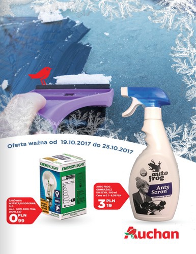 {loadposition linkAuchan} Nowa gazetka promocyjna Auchan. Polecane promocje z gazetki Auchan: Żarówka wstrząsoodporna GLS - 0,99 zł. Odmrażacz do szyb Auto Frog 500 ml - 3,19 zł. Skrobaczka z rączką - 0,98 zł. Zakupy w Auchan przez…