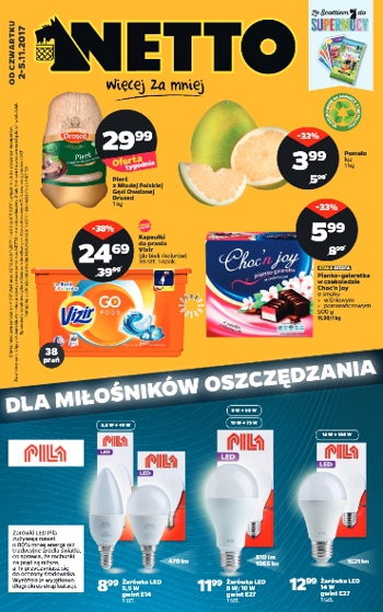 {loadposition linkNetto} Nowa gazetka promocyjna sieci sklepów Netto - "Dla miłośników oszczędzania". Polecane promocje z gazetki Netto: Żarówka LED E14 Pila - 8,99 zł. Żarówka LED E27 Pila - 11,99 zł. Kapsułki do prania Vizir 38…