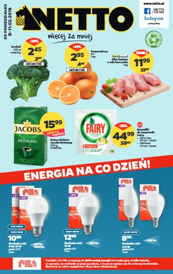 {loadposition linkNetto} Nowa gazetka promocyjna sieci sklepów Netto - "Energia na co dzień!". Polecane promocje z gazetki Netto: Żarówka LED Pila E14 5,5 W - 8,99 zł. Żarówka LED Pila E27 14 W - 12,99 zł. Filet świeży…