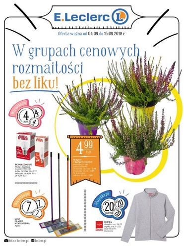 {loadposition linkEleclerc} 'W grupach cenowych rozmaitości bez liku!' - nowa gazetka promocyjna sieci handlowej E.Leclerc. Polecane promocje z gazetki E.Leclerc: Wrzos trójkolorowy w doniczce - 4,99 zł. Żarówka Philips Lighting Eco Halogen - 4 zł. Mop płaski mikrofibra Agilla…