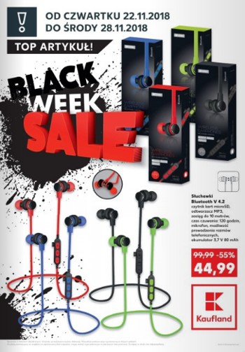 {loadposition linkKaufland} 'Black Week Sale' - nowa gazetka promocyjna sieci marketów Kaufland. Polecane promocje z gazetki Kaufland: Słuchawki Bluetooth V 4.2 - 44,99 zł. Żarówka LED Toshiba - 4,99 zł. Nutri blender Sencor 1000 W - 179,90 zł. …