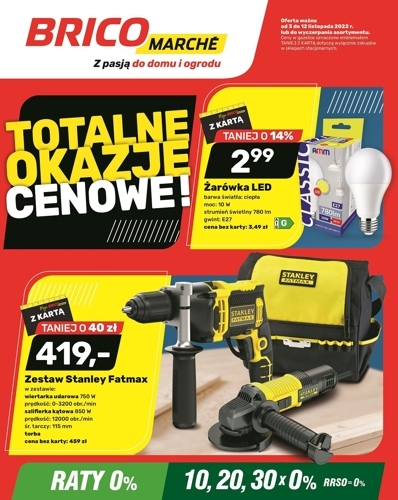 {loadposition linkBricomarche} 'Totalne okazje cenowe!' - nowa gazetka promocyjna sieci sklepów Bricomarche. Polecane promocje z gazetki Bricomarche: Żarówka LED 10 W - 2,99 zł*. Zestaw Stanley Fatmax - wiertarka udarowa, szlifierka kątowa i torba - 419 zł**. Gres szkliwiony…