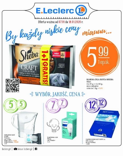 {loadposition linkEleclerc} 'By każdy niskie ceny miauuu...' - nowa gazetka promocyjna sieci handlowej E.Leclerc. Polecane promocje z gazetki E.Leclerc: Karma dla kota Sheba 4x85 g - 5,99 zł. Żarówka LED Philips - 7 zł. Papier ksero A4 Sky Copy…