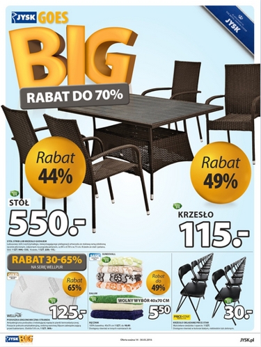 Nowa gazetka promocyjna JYSK. Polecane promocje z gazetki Jysk: Rabat 20-40% na wszystkie szafy. Rabat 20-60% na wszystkie akcesoria kuchenne. Rabat 20-60% na wszystkie zasłony prysznicowe. Oferta ważna od 14.03 do 30.03.