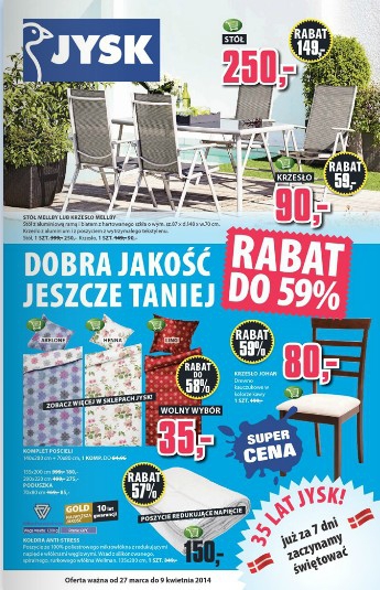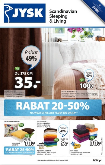 Nowa gazetka promocyjna JYSK - "Dobra jakość jeszcze taniej". Polecane promocje z gazetki Jysk: Rabat 20-40% na rolety i żaluzje. Rabat 25-50% na wszystkie zasłony prysznicowe. Rabat 20-40% na wszystkie stoły. Oferta ważna od 27.03 do 9.04.