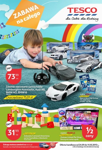 Nowy katalog sieci handlowej Tesco - "Zabawa na całego". Polecane promocje z katalogu Tesco: Zdalnie sterowany samochód - 73,99 zł. Zabawka Carousel drewniany sorter kształtów z klockami - 31,99 zł. Zestaw Littlest Pet Shop limuzyna zwierzątek - 59,99…
