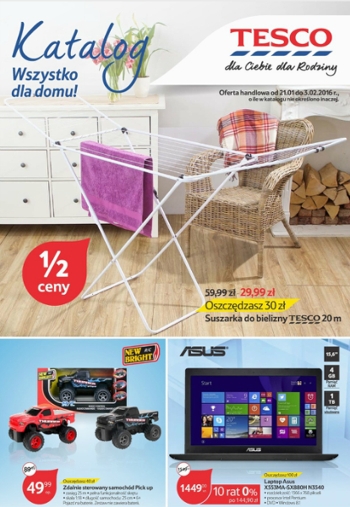 Nowy katalog sieci handlowej Tesco - "Wszystko dla domu!". Polecane promocje z katalogu Tesco: Suszarka do bielizny Tesco - 29,99 zł. Zdalnie sterowany samochód Pick up - 49,99 zł. Laptop Asus X553MA-SX880H N3540 - 1449 zł. Oferta…