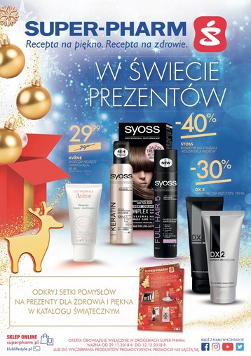 'W świecie prezentów' - nowa gazetka promocyjna Super-Pharm. Polecane promocje z gazetki Super-Pharm: Maseczka kojąco-nawilżająca Avene 50 ml - 29,99 zł. Zestaw Nivea Sensitive Recovery - 26,99 zł. Żel do mycia twarzy Physiogel 150 ml - 19,99 zł. …