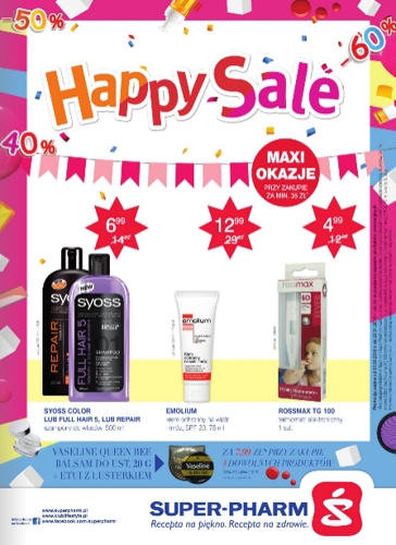 Nowa gazetka promocyjna Super-Pharm - "Happy Sale". Polecane promocje z gazetki Super-Pharm: Żel do włosów Taft 75 ml - 9,99 zł. Antybakteryjne mydło w płynie Carex 500 ml - 4,99 zł. Antyperspirant Bioliq 48 h 50 ml -…