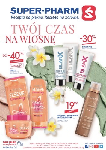 'Twój czas na wiosnę' - nowa gazetka promocyjna Super-Pharm. Polecane promocje z gazetki Super-Pharm: Żel pod prysznic Yope 400 ml - 12,99 zł. Płyn do płukania jamy ustnej Listerine 500 ml - 9,99 zł. Doppelherz Aktiv Complex 30…