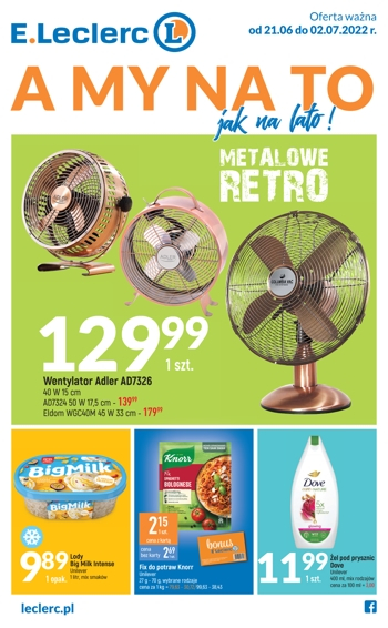 {loadposition linkEleclerc2} 'A my na to jak na lato!' - nowa gazetka promocyjna sieci handlowej E.Leclerc. Polecane promocje z gazetki E.Leclerc: Wentylator Adler AD7326 - 129,99 zł. Lody Big Milk Intense 1 L - 9,89 zł. Żel pod prysznic…