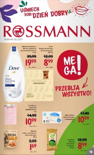 {loadposition linkRossmann} 'Mega! Przebija wszystko!' - nowa gazetka promocyjna drogerii Rossmann. Polecane promocje z gazetki Rossmann: Paleta do konturowania twarzy Makeup Obsession Wersow - 19,99 zł. Żel pod prysznic Dove Deeply Nourishing 500 ml - 8,99 zł. Odżywczy peeling…