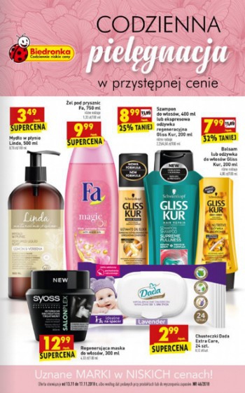 {loadposition linkBiedronka} 'Codzienna pielęgnacja w przystępnej cenie' - nowa gazetka promocyjna sieci sklepów Biedronka. Polecane promocje z gazetki sieci Biedronka: Mydło w płynie Linda 500 ml - 3,49 zł. Żel pod prysznic Fa 750 ml - 9,99…