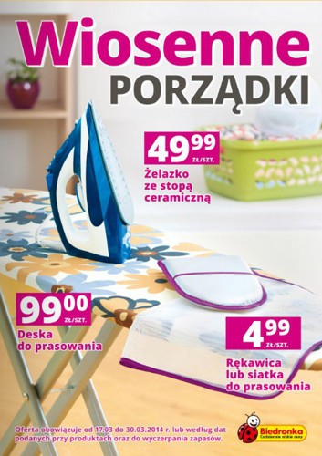 {loadposition linkBiedronka} Nowa gazetka promocyjna sieci handlowej Biedronka - "Wiosenne porządki". Polecane promocje z gazetki sieci Biedronka: Żelazko ze stopą ceramiczną - 49,99 zł. Deska do prasowania - 99,99 zł. Rękawica lub siatka do prasowania - 4,99 zł. …