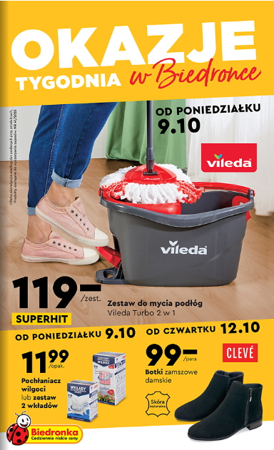 {loadposition linkBiedronka4} 'Okazje tygodnia' - nowa gazetka promocyjna sieci sklepów Biedronka. Polecane promocje z gazetki sieci Biedronka: Zestaw do mycia podłóg Vileda Turbo 2w1 - 119 zł. Pochłaniacz wilgoci lub zestaw 2 wkładów - 11,99 zł. Botki damskie zamszowe…
