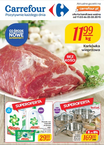 {loadposition linkCarrefour} Nowa gazetka promocyjna sieci handlowej Carrefour. Polecane promocje z gazetki Carrefour: Karkówka wieprzowa bez kości 1 kg - 11,99 zł. Kapsułki do prania Ariel 38 sztuk - 29,99 zł. Zestaw garnków Tefal Uno 7 elementów - 169…