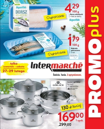 {loadposition linkIntermarche} 'Promo Plus' - nowa gazetka promocyjna sieci sklepów Intermarche Polecane promocje z gazetki Intermarche: Filet z dorsza atlantyckiego ze skórą 100 g - 4,29 zł. Makrela patroszona 100 g - 1,79 zł. Zestaw garnków Gerlach - 169…