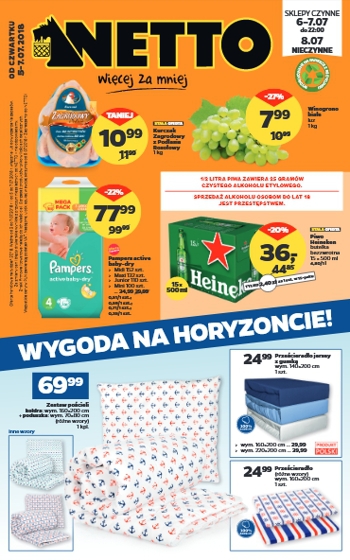 {loadposition linkNetto} 'Wygoda na horyzoncie' - nowa gazetka promocyjna sieci sklepów Netto. Polecane promocje z gazetki Netto: Zestaw pościeli - 69,99 zł. Prześcieradło jersey z gumką 140x200 cm - 24,99 zł. Piwo Heineken 15x500 ml - 36 zł. …