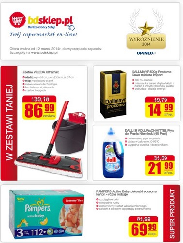 {loadposition linkBdsklep} Nowa gazetka promocyjna supermarketu internetowego Bdsklep.pl. Polecane promocje z gazetki Bdsklep.pl: Zestaw VILEDA Ultramax - 86,99 zł. Niemiecki płyn do prania DALLI Vollwachmittel 3 L - 21,99 zł. Kateter rektalny na kolkę WINDI - 28,99 zł. …