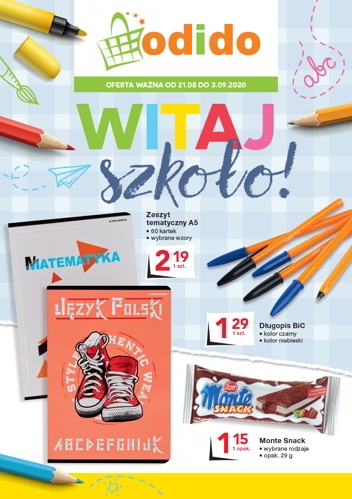 'Witaj szkoło!' - nowa gazetka promocyjna sklepów Odido. Polecane promocje z gazetki Odido: Zeszyt tematyczny A5 - 2,19 zł. Długopis BiC - 1,29 zł. Monte Snack 29 g - 1,15 zł. Oferta ważna od piątku 21.08 do…