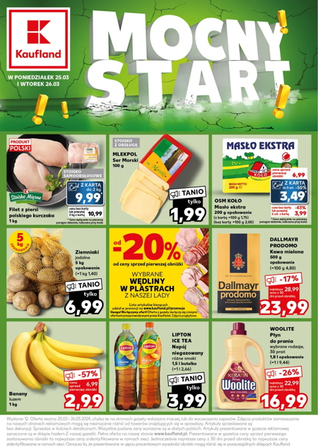 'Mocny start!' - nowa gazetka promocyjna sieci marketów Kaufland. Polecane promocje z gazetki Kaufland: Filet z piersi polskiego kurczaka 1 kg - 9,99 zł*. Ser Morski Mlekpol 100 g - 1,99 zł. Ziemniaki jadalne 5 kg - 6,99 zł.…