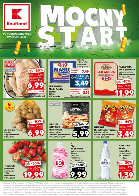 'Mocny start!' - nowa gazetka promocyjna sieci marketów Kaufland. Polecane promocje z gazetki Kaufland: Kurczak tuszka 1 kg - 6,99 zł*. Ziemniaki jadalne 5 kg - 6,99 zł. Pizza Bistro Proste Historie różne rodzaje - 5,99 zł. *…