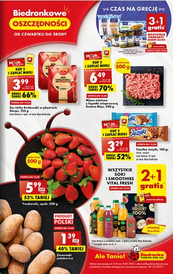 {loadposition linkBiedronka2} 'Biedronkowe oszczędności od czwartku do środy' - nowa gazetka promocyjna sieci sklepów Biedronka. Polecane promocje z gazetki sieci Biedronka: Ser żółty Królewski w plastrach Sierpc 135 g - 3,99 zł*. Truskawki 500 g - 599 zł**. Ziemniaki…