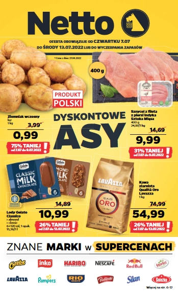{loadposition linkNetto} 'Dyskontowe asy' - nowa gazetka promocyjna sieci sklepów Netto. Polecane promocje z gazetki Netto: Ziemniak wczesny 1 kg - 0,99 zł*. Sznycel z fileta z piersi indyka Sztuka Mięsa 400 g - 9,99 zł**. Lody Gelato Classico…
