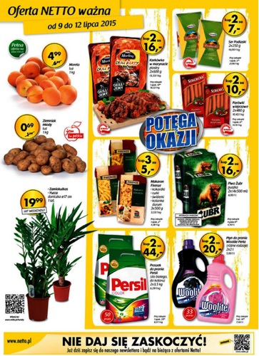 {loadposition linkNetto} Nowa gazetka promocyjna Netto - "Potęga okazji". Polecane promocje z gazetki Netto: Morele 1 kg - 4,99 zł. Ziemniaki młode 1 kg - 0,69 zł. Yucca doniczka - 19,99 zł. Oferta ważna od 9.07 do…
