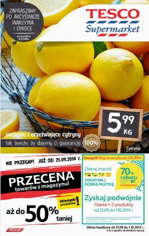 Nowa gazetka promocyjna Tesco. Polecane promocje z gazetki Tesco: Cytryny 1 kg - 5,99 zł. Ziemniaki 10 kg - 3,79 zł. Marchew 5 kg - 3,99 zł. Oferta ważna od 25.09 do 1.10, o ile w gazetce…