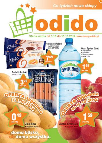 Nowa gazetka promocyjna sklepów Odido. Polecane promocje z gazetki Odido: Ziemniaki 1 kg - 0,49 zł. Woda Żywiec Zdrój 1,5 L - 1,69 zł. Parówki Berlinki 250 g - 3,79 zł. Oferta ważna od 3.10 do 15.10.