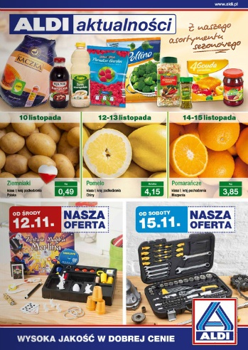 {loadposition linkAldi} Nowa gazetka promocyjna Aldi. Polecane promocje z gazetki Aldi: Pomarańcze 1 kg - 3,85 zł. Pomelo 1 sztuka - 4,15 zł. Ziemniaki 1 kg - 0,49 zł. Oferta ważna od 12.11 do wyczerpania zapasów.