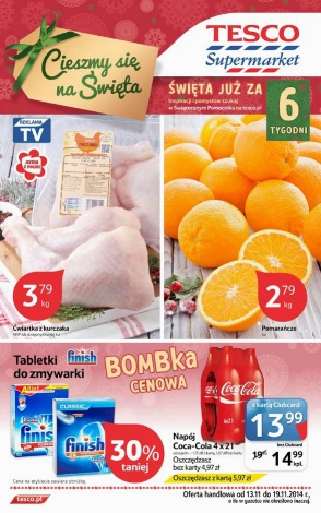 Nowa gazetka promocyjna Tesco - "Cieszmy się na święta". Polecane promocje z gazetki Tesco: Ćwiartka z kurczaka 1 kg - 3,79 zł. Pomarańcze 1 kg - 2,79 zł. Ziemniaki 5 kg - 1,99 zł. Oferta ważna od…