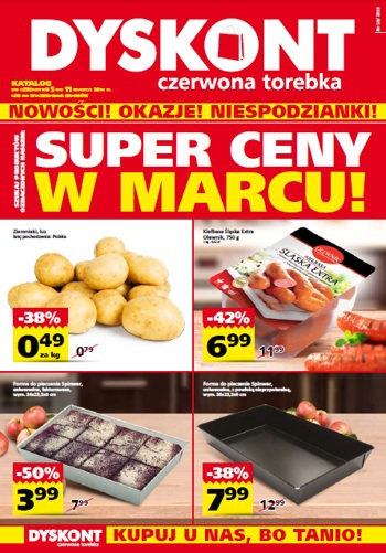 Nowy katalog sieci handlowej Czerwona Torebka - "Super ceny w marcu!". Polecane promocje z katalogu sieci Czerwona Torebka: Ziemniaki 1 kg - 0,49 zł. Kiełbasa Śląska Extra Olewnik 750 g - 6,99 zł. Forma do pieczenia Spinwar wym.…
