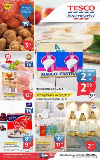 Nowa gazetka promocyjna Tesco. Polecane promocje z gazetki Tesco: Ziemniaki 5 kg - 3,45 zł. Filet z kurczaka 1 kg - 12,99 zł. Ptasie Mleczko Wedel 380 g - 9,99 zł. Oferta ważna od 15.10 do 21.10,…