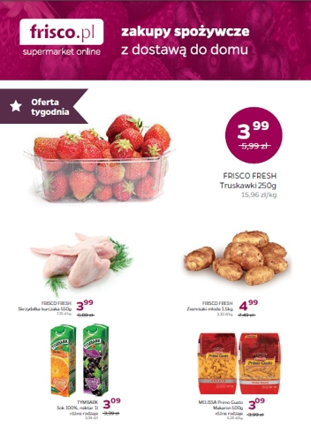 Nowa gazetka promocyjna supermarketu internetowego Frisco.pl - "Zimowe obniżki do -40%". Polecane promocje z gazetki Frisco.pl: Truskawki 250 g - 3,99 zł. Skrzydełka kurczaka 550 g - 3,99 zł. Ziemniaki młode 1,5 kg - 4,99 zł. Sok lub…