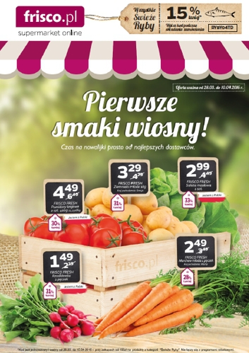 Nowa gazetka promocyjna supermarketu internetowego Frisco.pl - "Pierwsze smaki wiosny!". Polecane promocje z gazetki Frisco.pl: Ziemniaki młode 1 kg - 3,29 zł. Sałata masłowa 1 sztuka - 2,99 zł. Marchew młoda 1 pęczek - 2,49 zł. Rzodkiewka 1…