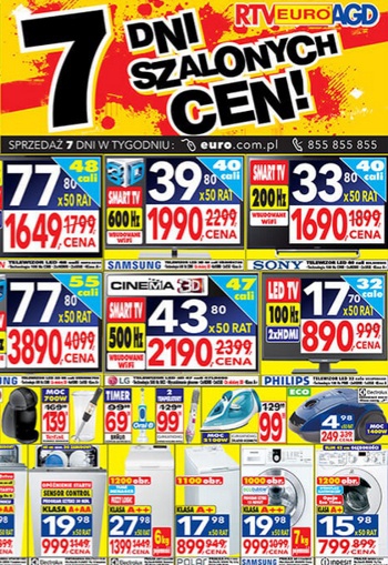 Nowa gazetka promocyjna RTV EURO AGD - "7 dni szalonych cen!". Polecane promocje z gazetki RTV EURO AGD: Telewizor LED 48" Thomson 48FZ3233 - 1649 zł. Telewizor LED 3D 40" Samsung UE40H6700 - 1990 zł. Zmywarka do zabudowy…