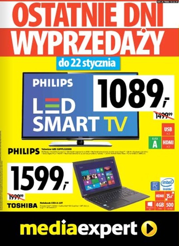 {loadposition linkMediaExpert} Nowa gazetka promocyjna Media Expert - "Ostatnie dni wyprzedaży". Polecane promocje z gazetki Media Expert: Telewizor LED 32" PHILIPS 32PFL3208H - 1089 zł. Notebook TOSHIBA C50-A-19T - 1599 zł. Zmywarka wolnostojąca ELECTROLUX ESF 6210 LOX - 1099…