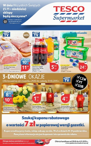 Nowa gazetka promocyjna Tesco. Polecane promocje z gazetki Tesco: Schab wieprzowy bez kości 1 kg - 11,94 zł. Kapsułki do prania Persil 32 sztuki - 24,99 zł. Znicz szklany Złota Kapliczka 135 g 35 h - 1,99 zł.…
