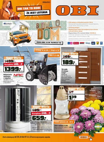 {loadposition linkObi} Nowa gazetka promocyjna Obi - "Obi tak to robi, że ceny spadają". Polecane promocje z gazetki Obi: Odśnieżarka spalinowa z napędem - 1399 zł. Kabina Cordia z hydromasażem - 659 zł. Znicz szklany 50 g - 1,39…