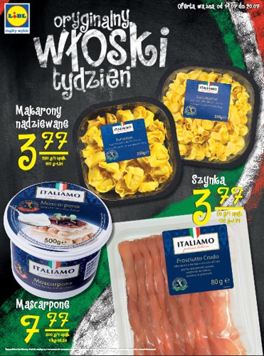 {loadposition linkLidl} Nowa gazetka promocyjna Lidl - "Oryginalny włoski tydzień". Polecane promocje z gazetki Lidl: Makaron nadziewany 250 g - 3,77 zł. Szynka Prosciutto 80 g - 3,77 zł. Mascarpone 500 g - 7,77 zł. Akcje promocyjne z…